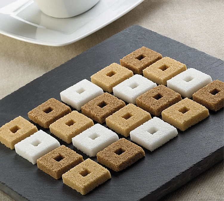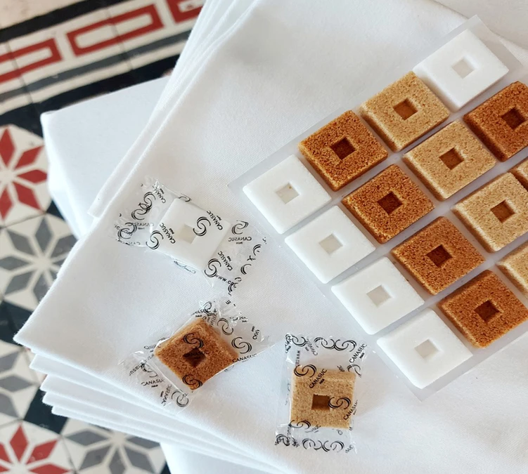 Ce sucre moulé est décliné en deux possibilités : sucre de canne blanc et sucre de canne roux.