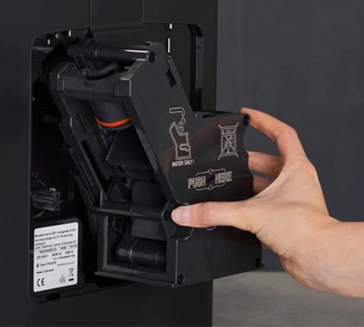 L’entretien est un jeu d’enfant avec la Siemens EQ.6 + : Ouvrez la trappe située sur le côté de la machine, retirez le groupe, rincez le sous l’eau tiède et le tour est joué !